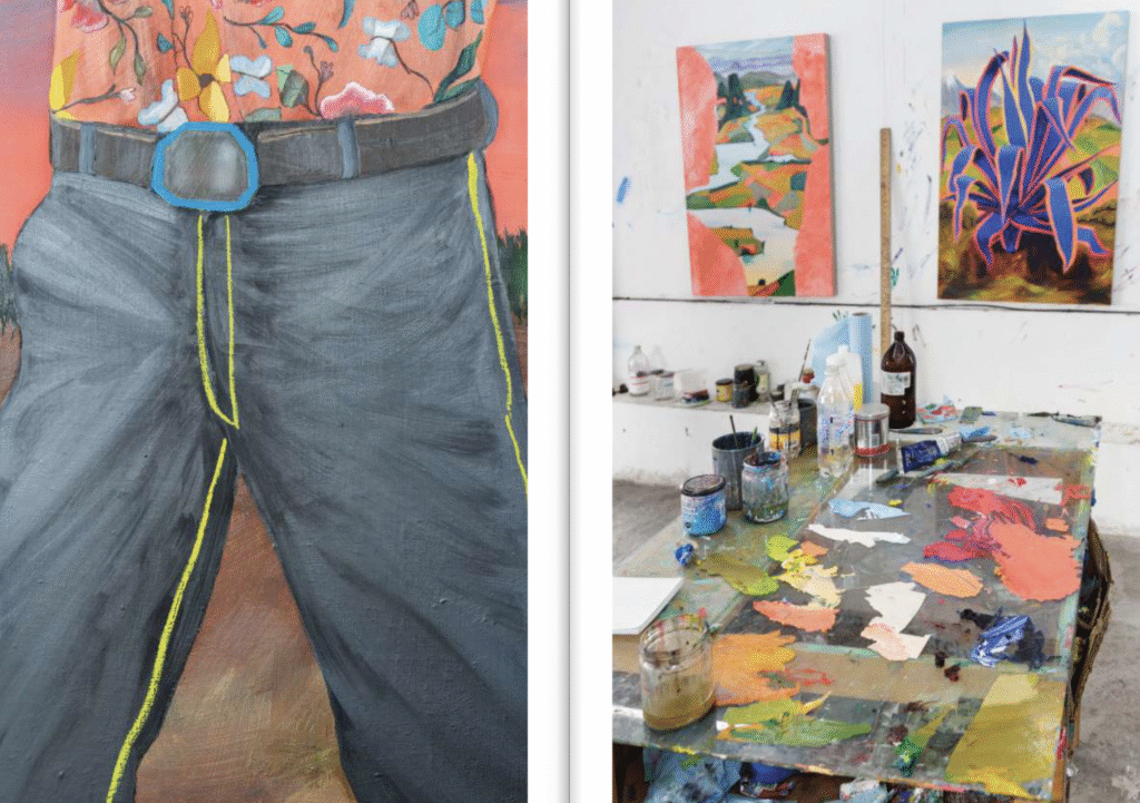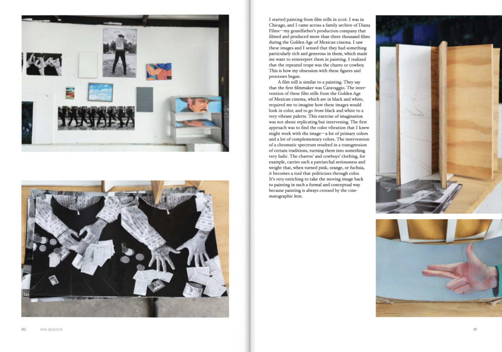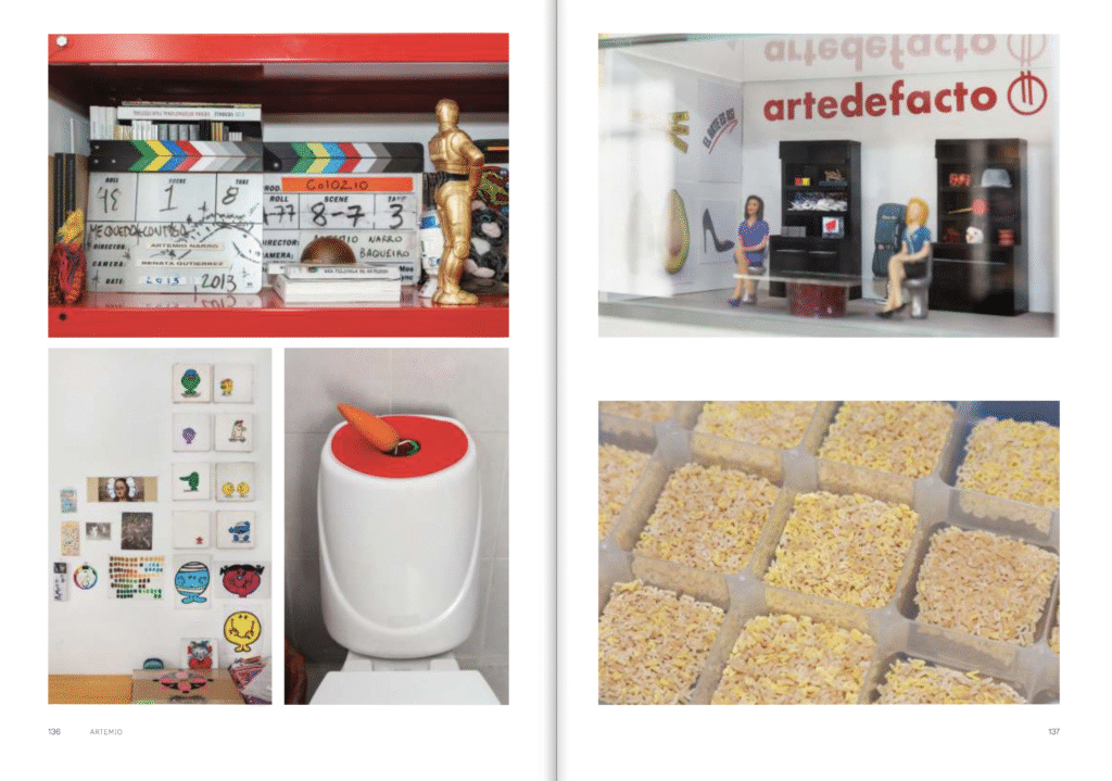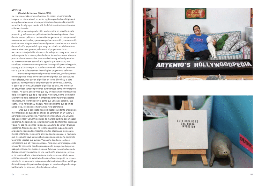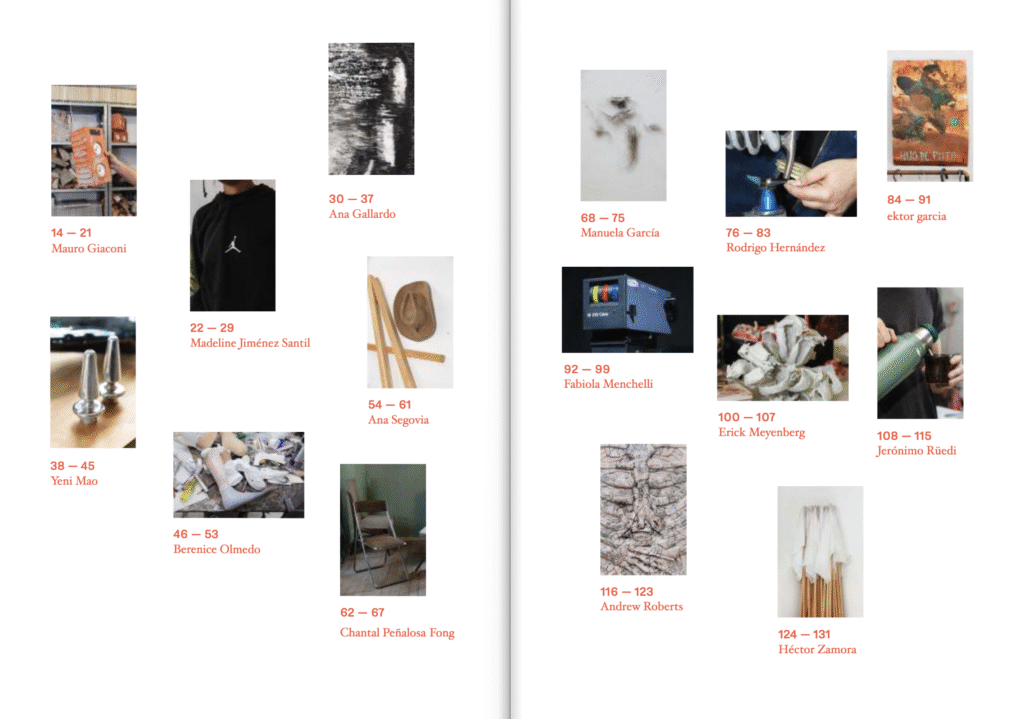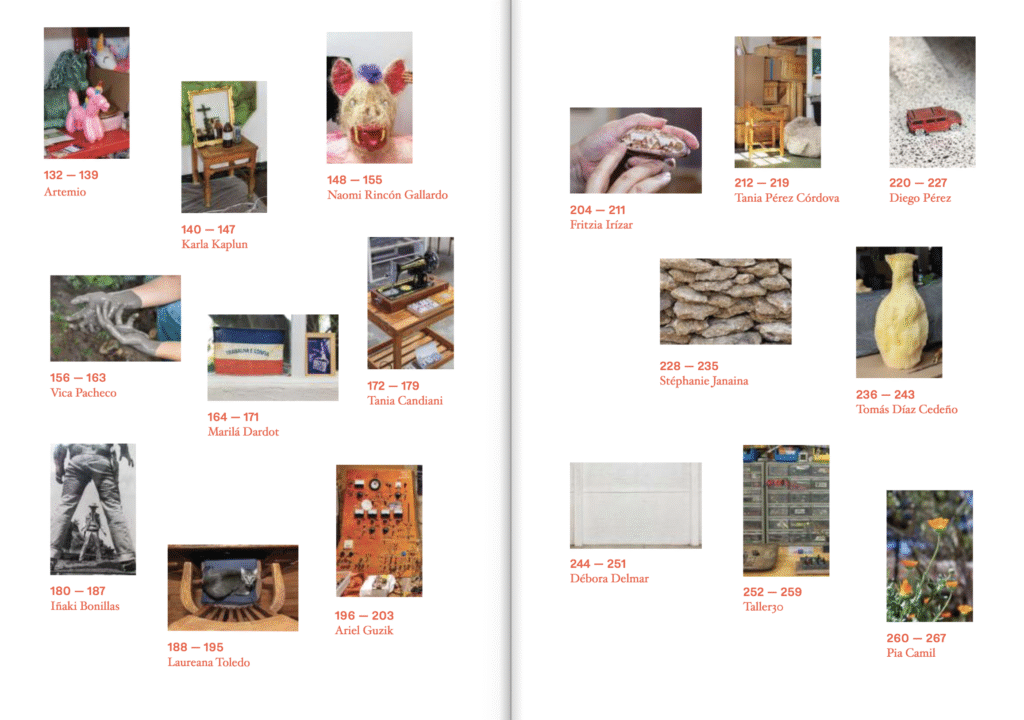 Vistas es probablemente el corazón del libro. Presenta una cartografía íntima y diversa de los talleres —espacios privados, híbridos, informales, a veces improvisados— donde conviven materiales de descarte, cámaras, herramientas industriales, trozos de madera o metal, papeles, telas, pinceles y pantallas. Cada artista revela sus obsesiones. Las fotografías —de Natanael Guzmán y Enrique Arechevala— cumplen una función clave: no son mero ornamento, sino evidencia. El lector puede ver los talleres tal como son: su luz, su orden y desorden, y su atmósfera. Esa materialidad confronta la imagen idealizada del estudio perfecto; recuerda que el arte es a menudo un trabajo de pulso, de ensayo-error, de convivencia con la precariedad, con lo inacabado.
