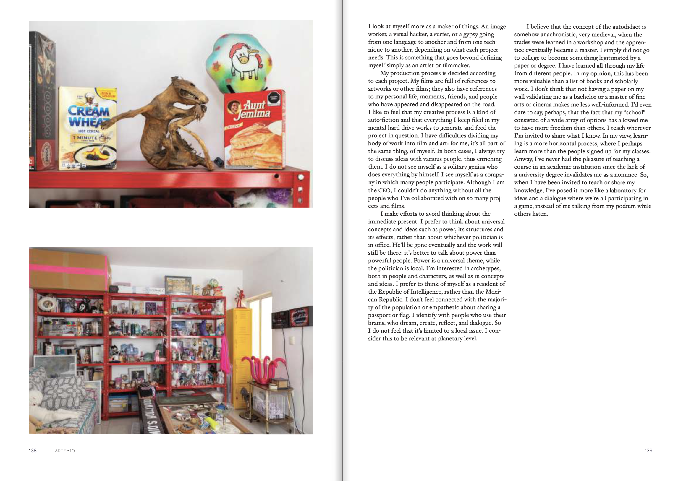 Vistas es probablemente el corazón del libro. Presenta una cartografía íntima y diversa de los talleres —espacios privados, híbridos, informales, a veces improvisados— donde conviven materiales de descarte, cámaras, herramientas industriales, trozos de madera o metal, papeles, telas, pinceles y pantallas. Cada artista revela sus obsesiones. Las fotografías —de Natanael Guzmán y Enrique Arechevala— cumplen una función clave: no son mero ornamento, sino evidencia. El lector puede ver los talleres tal como son: su luz, su orden y desorden, y su atmósfera. Esa materialidad confronta la imagen idealizada del estudio perfecto; recuerda que el arte es a menudo un trabajo de pulso, de ensayo-error, de convivencia con la precariedad, con lo inacabado.