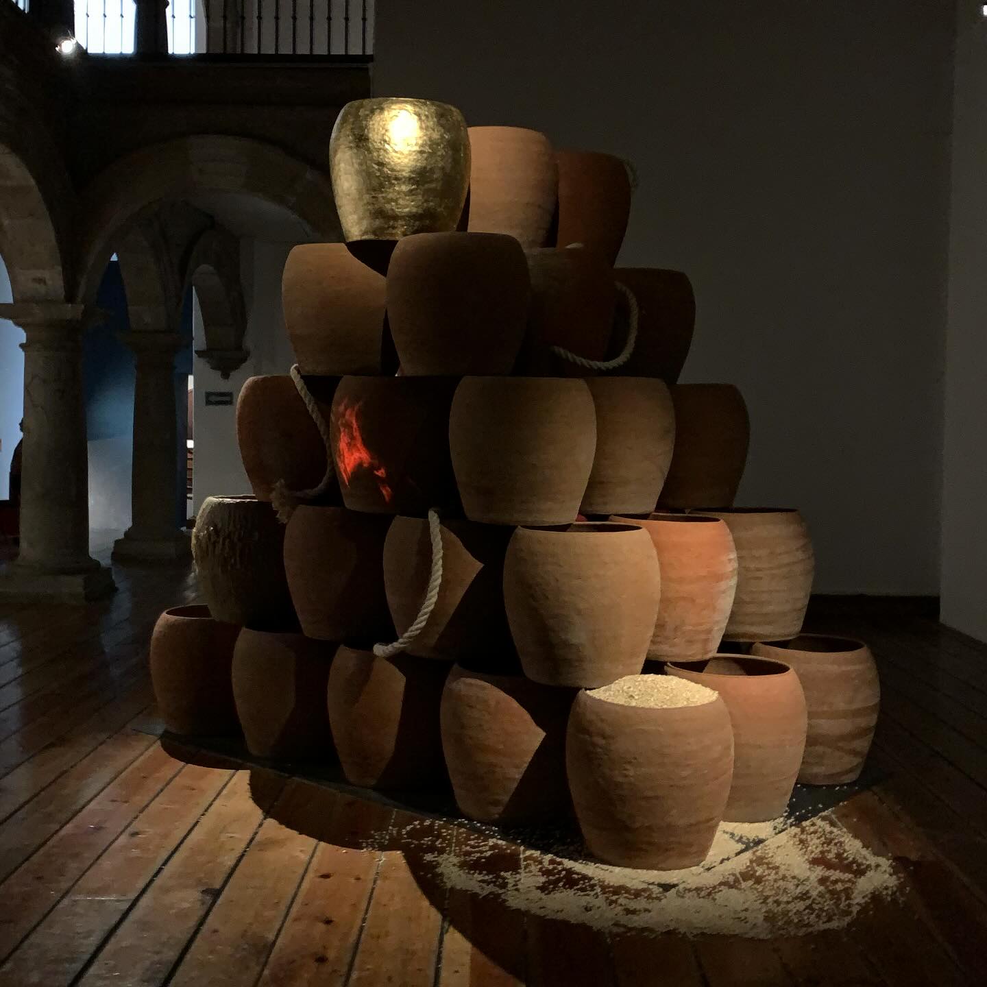 Esta relación entre memoria y transmisión también aparece con fuerza en la obra de Ana Hernández, cuya exposición Ná’ Reza [Mano rota] en el Laboratorio Arte Alameda complejiza la discusión al situarla en el terreno de la materialidad, la técnica y la herencia cotidiana. A través de barro, maíz, polvo y comixcales —ollas de doble boca utilizadas en las cocinas del Istmo de Tehuantepec—, Hernández activa una memoria que no se presenta como símbolo abstracto de identidad, sino como práctica encarnada y conocimiento transmitido de generación en generación. En piezas como Cayaca Dee [se hace polvo] o La promesa, el barro no aparece como simple materia, sino como una tecnología ancestral que pone en escena la fragilidad y persistencia de ciertos saberes frente a la lógica productivista y extractiva contemporánea.